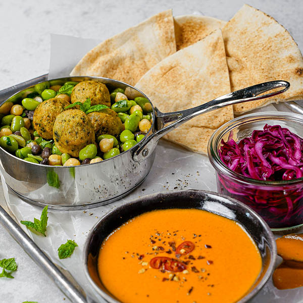 Tilbered falafel som anvis på emballagen. Server falaflerne i en bowle sammen med den marineret bønnemix, syltet løg og kål, samt den ristet pebersauce.