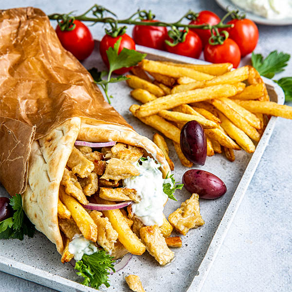 Top med lidt fersk persille.Lakto-vegetarisk gyros med veganske stykker chicken style. Perfekt til frokostbordet eller som take away.