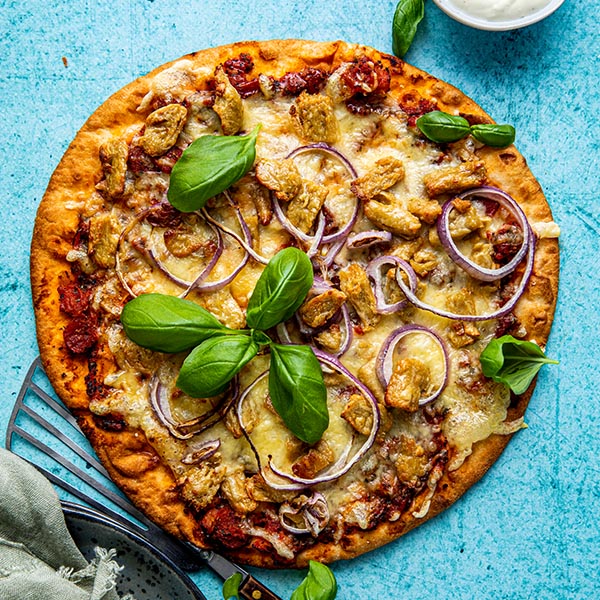 Top den færdigbagte pizza med fersk basilikum.Hvem kan ikke lide pizza og så en vegansk pizza? Nu kan flere gæster nyde rigtig god pizza. Toppet med strimlet rødløg og veganske stykker chicken style. Godt og klimasmart!