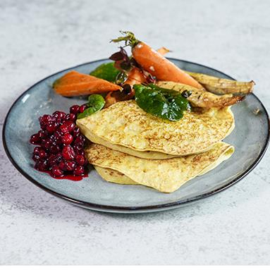 4. Server kartoffelpandekagen med ovnristede grøntsager og tyttebærsyltetøj.