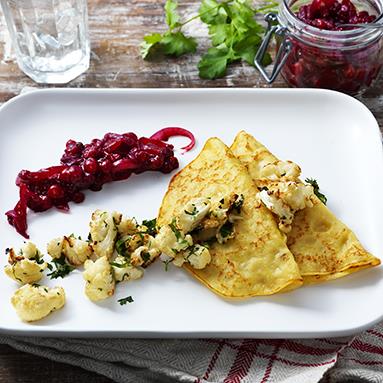 Kartoffelpandekager med ristede blomkål og tyttebær