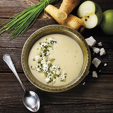 2. Skær æblet i fine tern. pres limesaft over, smuldr fetaosten og tilsæt purløg. Server suppen og strø toppingen over.