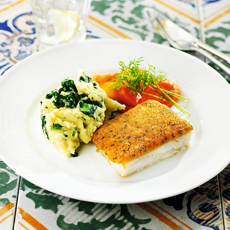 Rensede fileter af Alaskasej** (FISK) 75% (*Gadus chalcogrammus*), vand, majssemolina*, kartofler* 3%, rapsolie*, løg* 2%, majsstivelse*, persille*, salt, eddike*, citronsyre, hvid peber*.*Økologisk ingrediens (100% økologiske ingredienser af landbrugoprindelse)