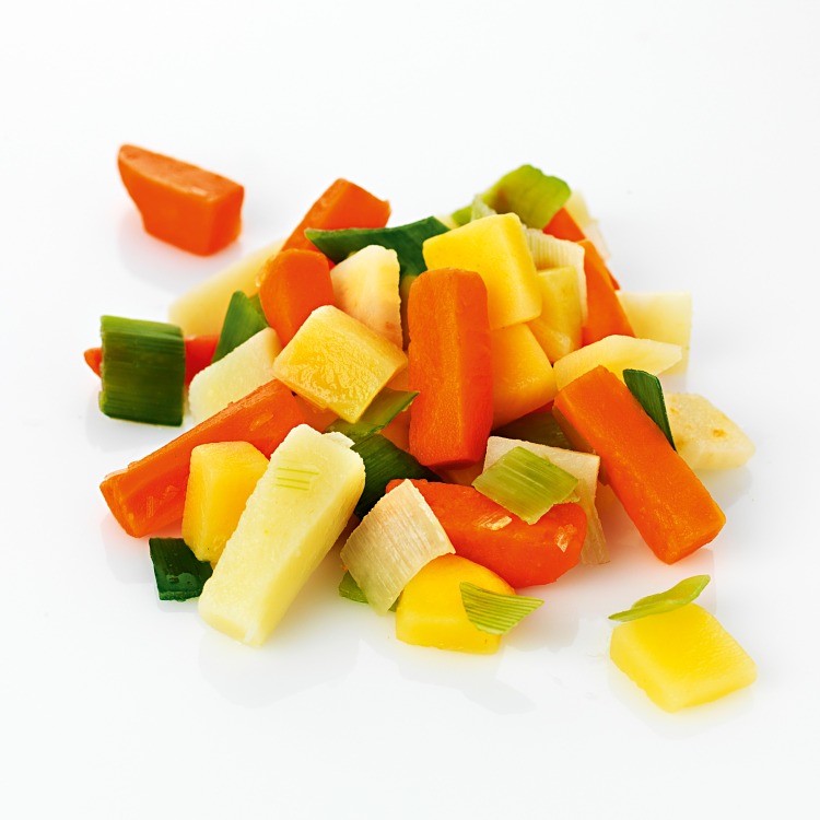 Fem minutter før servering tilsættes rodfrugter: gulerødder, selleri, kålroer, pastinak og porrer. Godt og nemt i både gryderetter, supper m.m.
